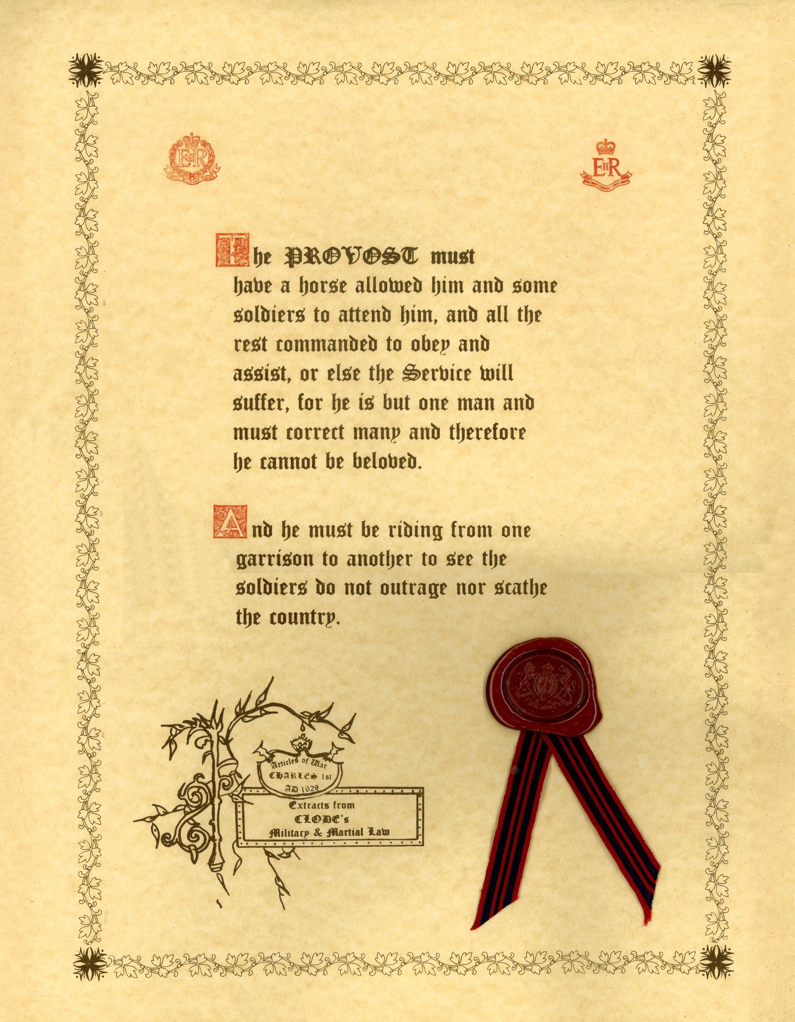 At the opening of the sixteenth century there are many contemporary references to a well established Provost Service, whose duties were laid down in the Articles of War of Henry VIII in 1513, of which the maintenance of military discipline was the most important.